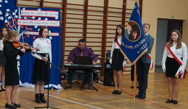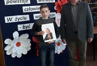 W związku z nadaniem imienia szkoły Biblioteka szkolna wraz z zespołem nauczycieli przeprowadziła szkolne konkursy : poetycki, plastyczny i wiedzy o przyszłym Patronie.