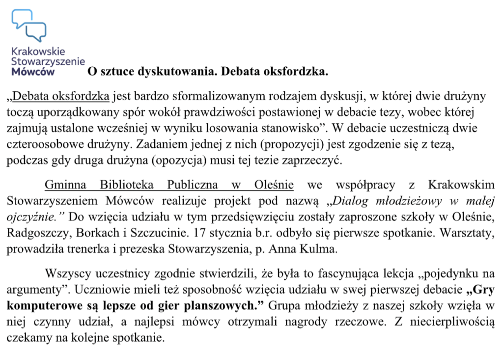 Debata oksfordzka w Gminnej Bibliotece Publicznej w Oleśnie 22 stycznia 2024spolesno debata1debata6debata5debata4debata3debata2debata7debata10debata8debata9