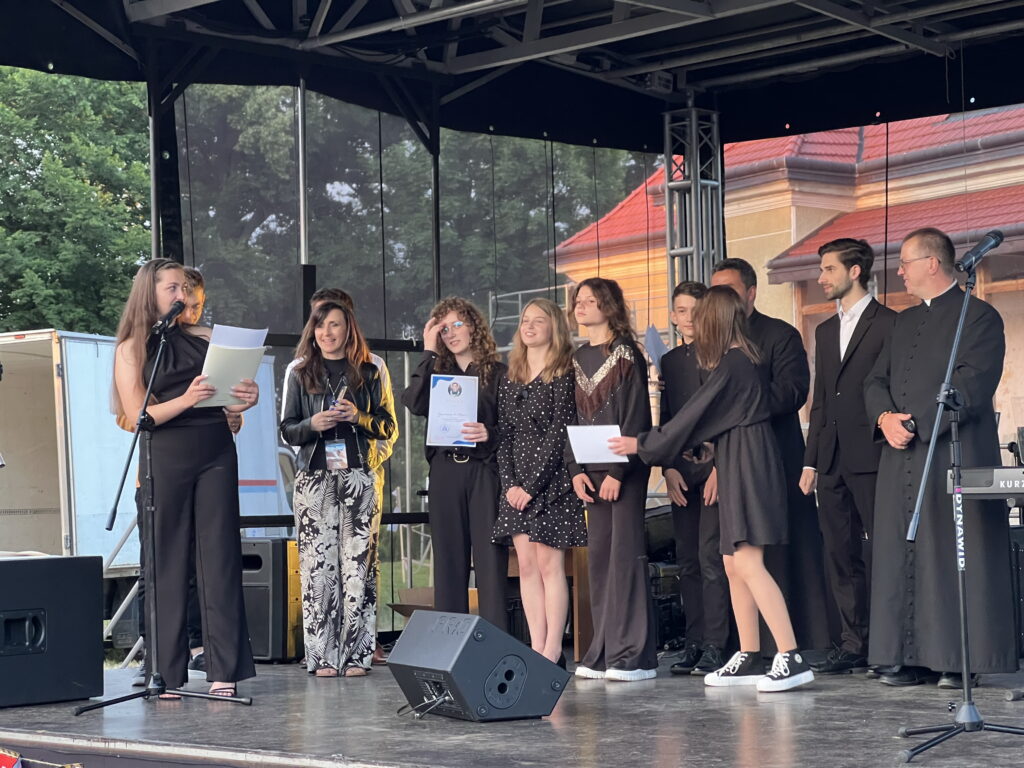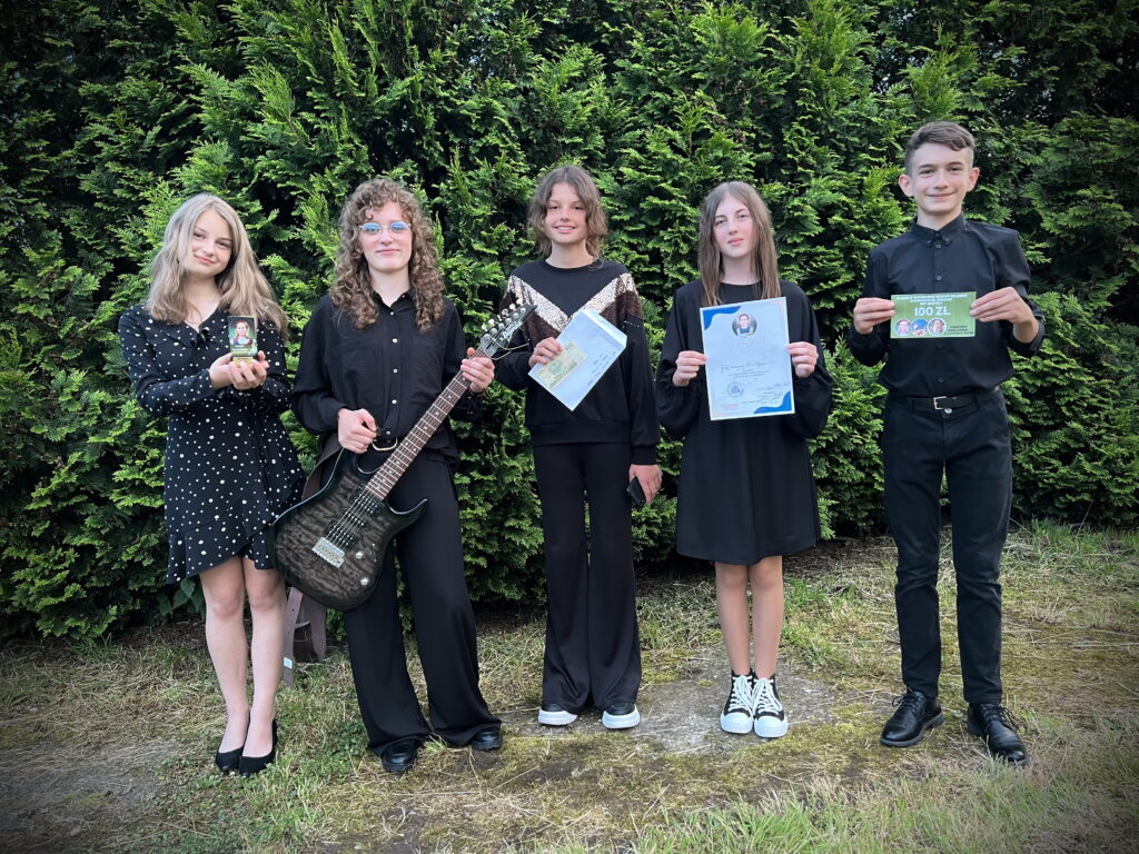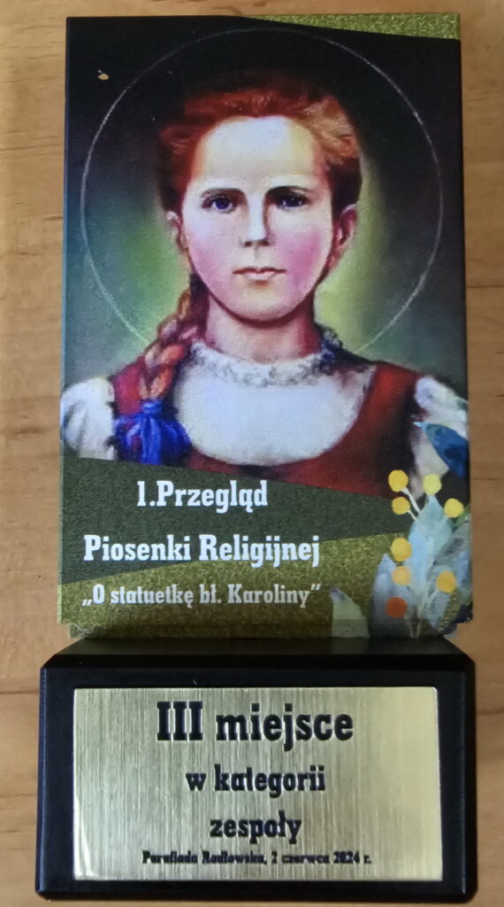 2 czerwca 2024 roku uczniowie Szkoły Podstawowej w Oleśnie wzięli udział w konkursie piosenki religijnej o statuetkę błogosławionej Karoliny w Radłowie. Uczniowie w składzie: Joanna Piątek (skrzypce i wokal), Zuzanna Curyło (wokal), Maja Świałowska (gitara elektryczna), Wiktoria Płaneta (perkusja), Adam Chlastawa (keyboard), przygotowani przez Pana Wojciecha Króla zajęli III miejsce w konkursie, w kategorii Zespoły wokalne i wokalno-instrumentalne. Gratulujemy ogromnego sukcesu! W pierwszym etapie przesłuchań w Gminnym Centrum Kultury i Czytelnictwa w Radłowie uczniowie zaprezentowali dwa utwory – Biała Lilia oraz List do Boga. Po obradach, jury nagrodziło naszych uczniów podium i zaprosiło do występu na scenie w czasie trwającej Parafiady Radłowskiej, gdzie zaprezentowali utwór Biała Lilia.