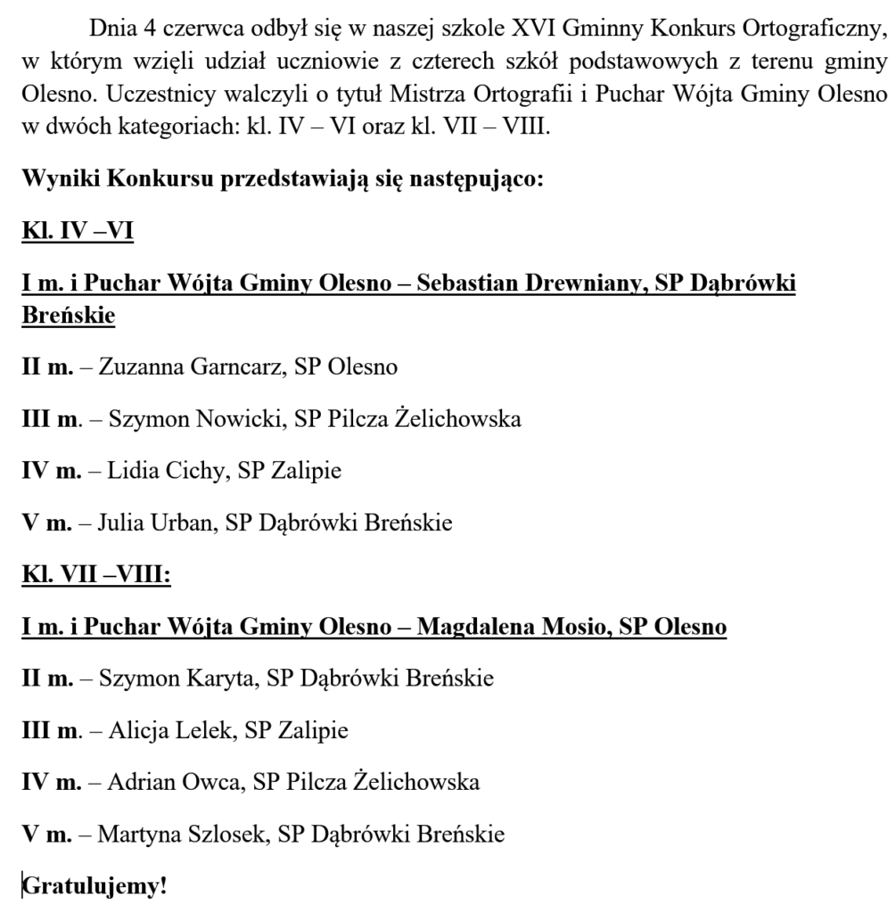 XVI GMINNY KONKURS ORTOGTAFICZNY KLAS IV – VIII