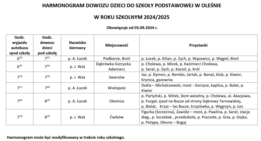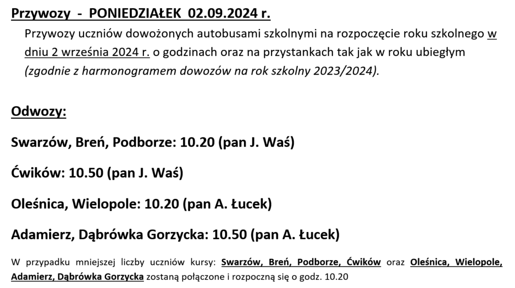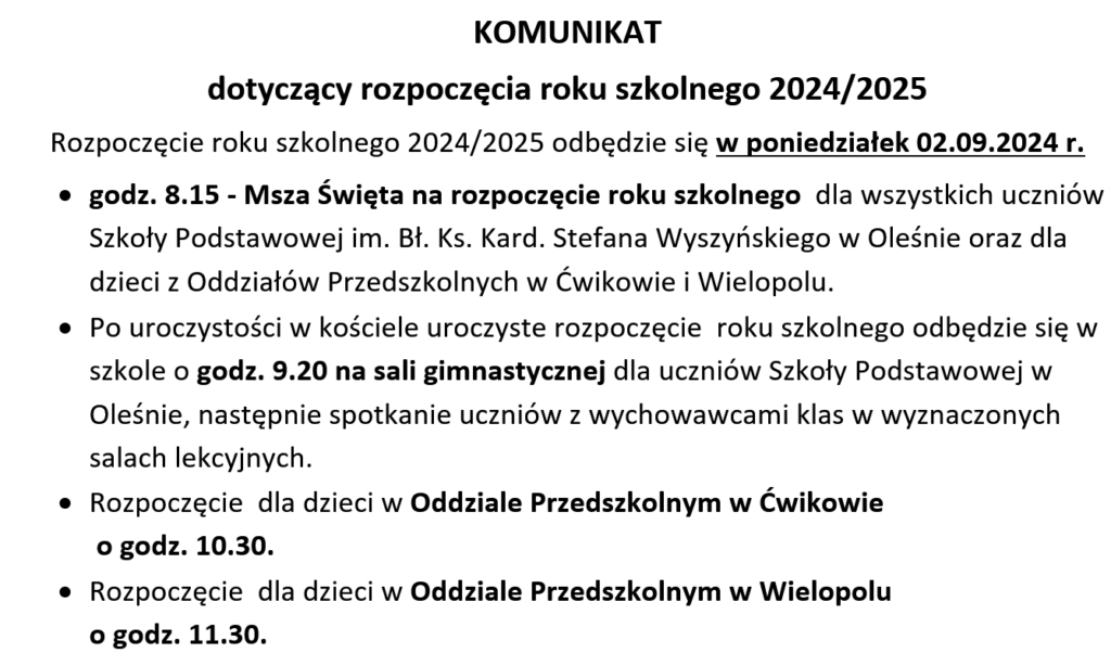 Komunikat dotyczący początku roku szkolnego 2024/2025