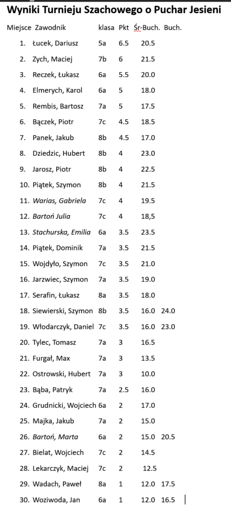 W połowie października w naszej szkole pan Henryk Janeczek zorganizował „Turniej szachowy o Puchar Jesieni”. Turniej cieszył się dużą popularnością ze względu na braki sprzętowe turniej ograniczono do uczniów klas VI – VIII.