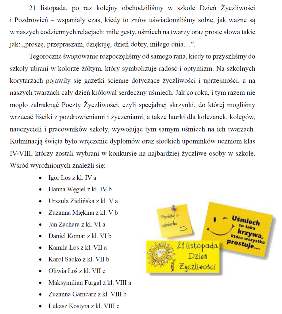Dzięki naszemu zaangażowaniu „dzień życzliwości” upłynął w atmosferze uśmiechu, miłych gestów i dobrej zabawy. Pamiętajmy jednak o byciu życzliwym codziennie, a nie tylko od święta.