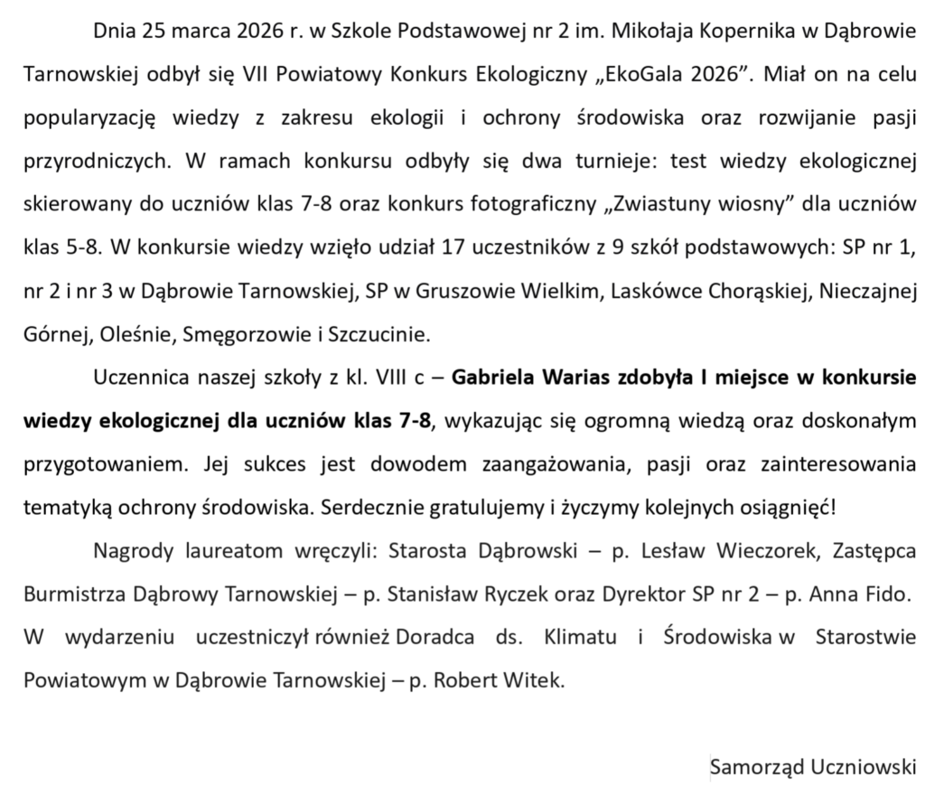 Sukces naszej uczennicy Gabrieli Warias w VII Powiatowym Konkursie Ekologicznym „EkoGala 2026” 31 marca 202631 marca 2026spolesno