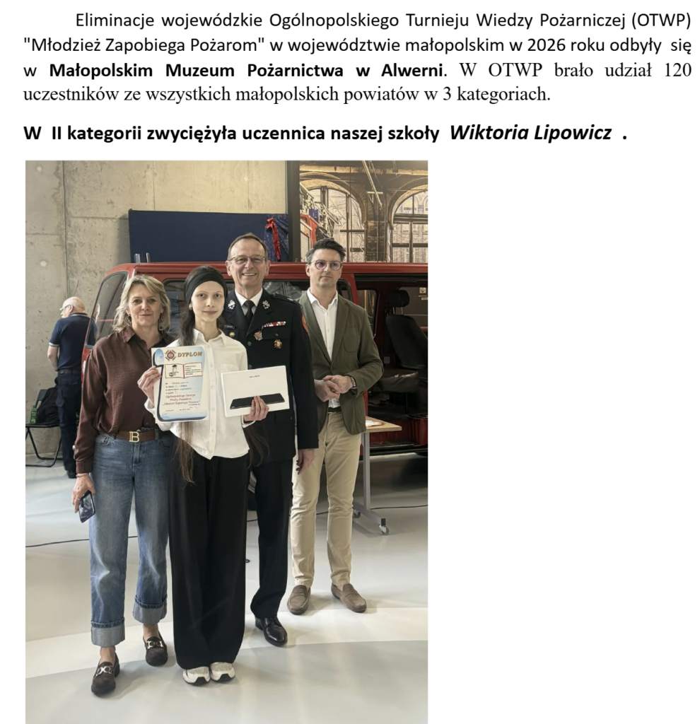 Duży sukces Wiktorii w Eliminacjach wojewódzkich Ogólnopolskiego Turnieju Wiedzy Pożarniczej 26 kwietnia 202626 kwietnia 2026spolesno Gratulacje dla Wiktorii. Życzymy sukcesów w finale centralnym 29-31.05 2026r. w Częstochowie.