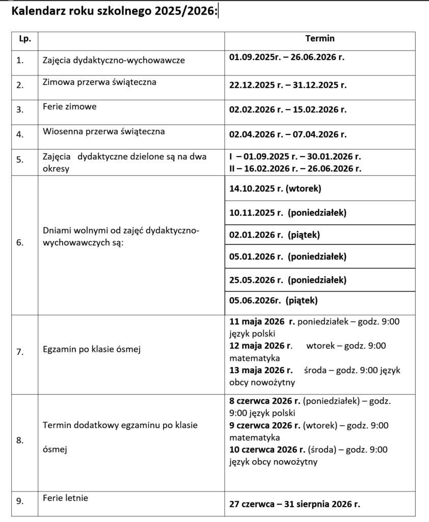 Kalendarz roku szkolnego 2025/2026