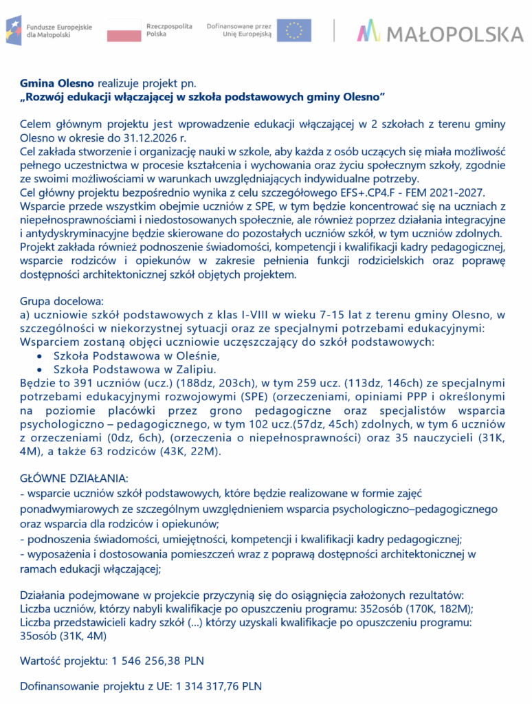 „Rozwój edukacji włączającej w szkołach podstawowych gminy Olesno” Klauzula Informacyjna dla Uczestnika. Formularz zgłoszeniowy rodzic. Formularz zgłoszeniowy dziecko. Formularz zgłoszeniowy nauczyciel. Informacja gdzie i co zamieszczać na stronach internetowych i facebooku.